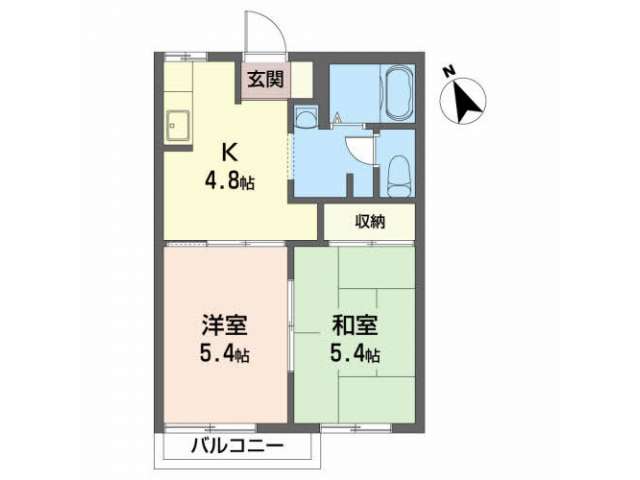 | 詳細間取 | 2K (和5.4帖×1、洋5.4帖×1、キッチン4.8帖) | ||