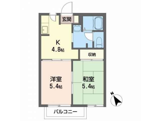 | 詳細間取 | 2DK (和5.4帖×1、洋5.4帖×1、DK4.8帖) | ||