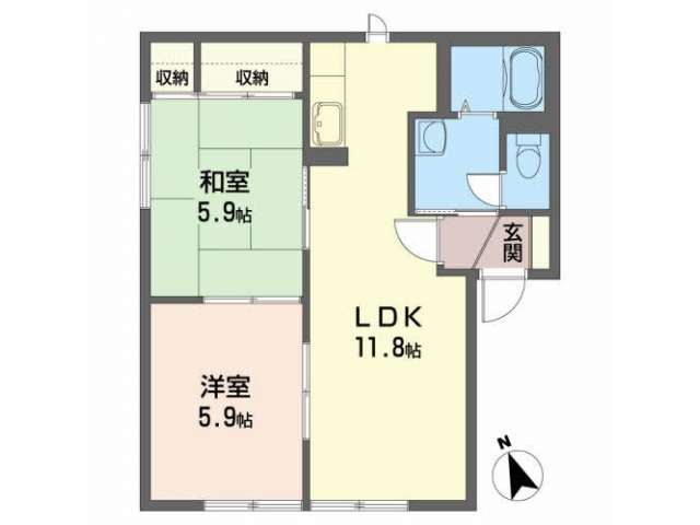 | 詳細間取 | 2LDK (和5.9帖×1、洋5.9帖×1、LDK11.8帖) | ||