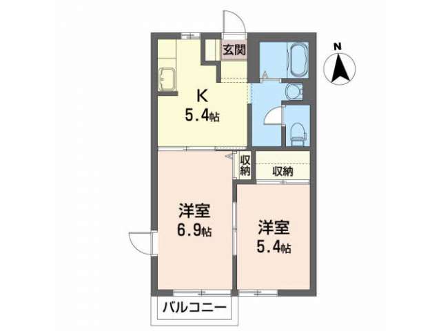 | 詳細間取 | 2K (和5.4帖×1、洋6.9帖×1、キッチン5.4帖) | ||