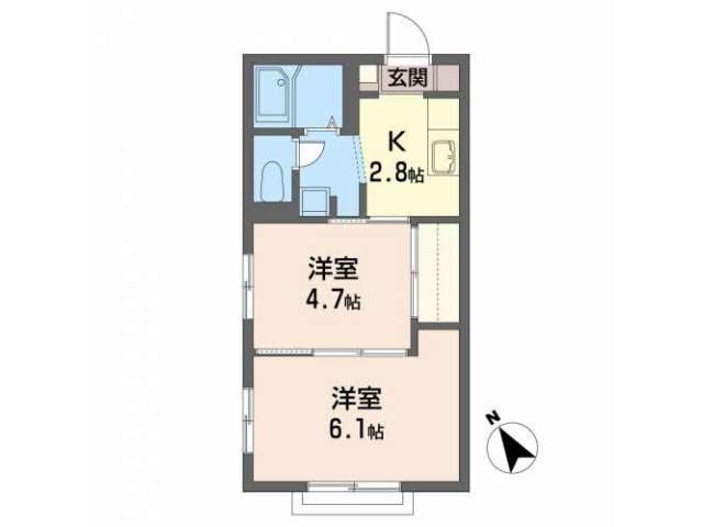 | 詳細間取 | 2K (洋6.1帖×1、洋4.7帖×1、キッチン2.8帖) | ||