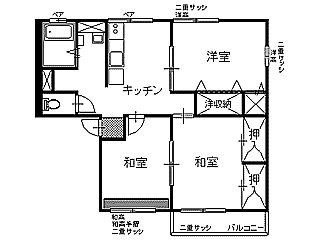 | 詳細間取 | 3K (和6帖×1、洋6帖×1、和5.5帖×1、キッチン4帖) | ||