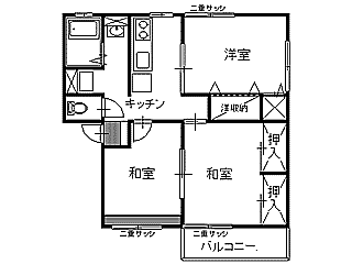 | 詳細間取 | 3K (和6帖×1、洋6帖×1、和5.5帖×1、キッチン4帖) | ||
