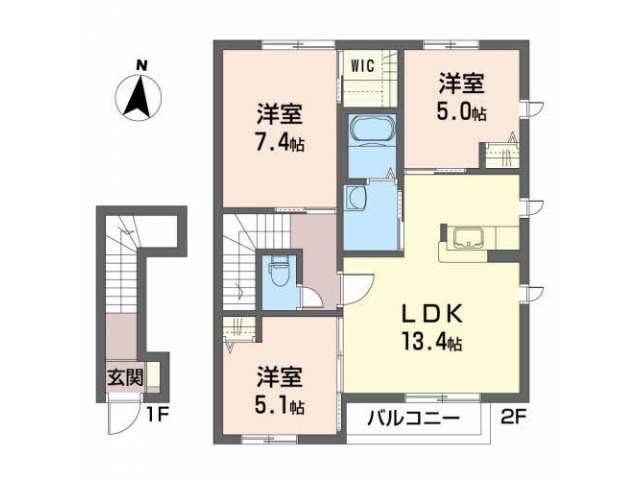 | 詳細間取 | 3LDK (洋5.1帖×2、洋7.4帖×1、LDK13.4帖) | ||