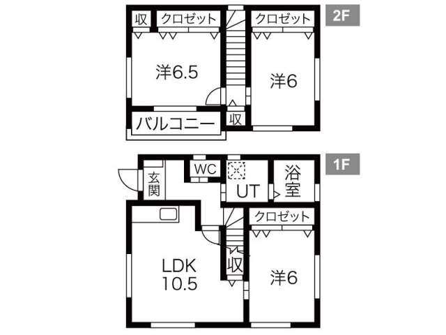 | 詳細間取 | 3LDK (洋6帖×1、2階:洋6帖×1、2階:洋6.5帖×1、LDK10.5帖) | ||