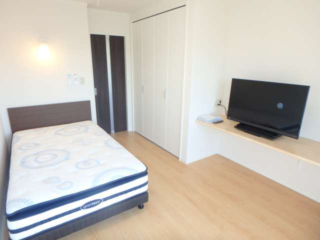 | 備考 | 賃料フリーレント1ヶ月。構造:2×4工法。TV、冷蔵庫、オーブンレンジ、洗濯機、セミダブルベッド、食器棚、カーテン一式が設置されています。Wi-Fi無料。全面禁煙。1年未満の解約の場合は違約金有。駐車場契約必須。退去時ハウスクリーニング・エアコンクリーニング費用等借主負担。単身者利用のみ。契約時に家財保険料2年間分18,000円がかかり、2年ごとに更新です。契約期間2年ごとに契約更新事務料20,000円(税別)がかかります。 普通賃貸借 ※同業他社による客付け不可 | ||