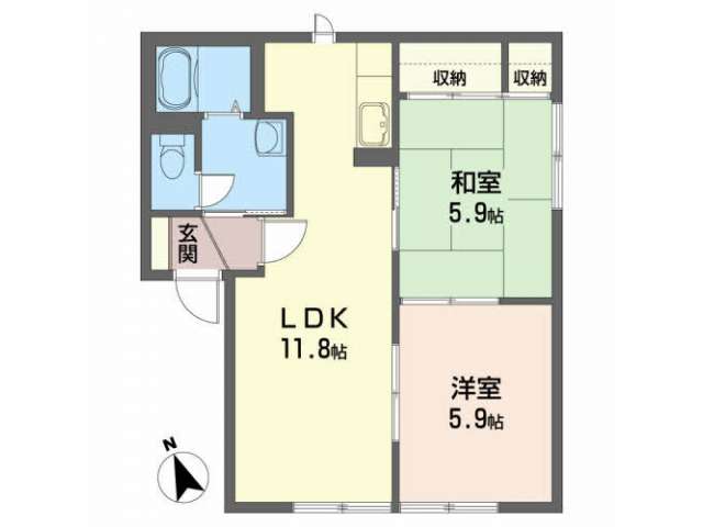 | 詳細間取 | 2LDK (和5.9帖×1、洋5.9帖×1、LDK11.8帖) | ||