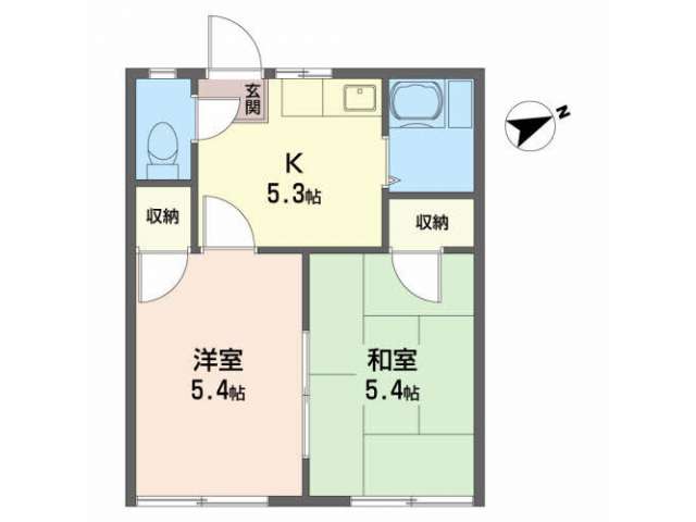 | 詳細間取 | 2K (洋5.4帖×1、和5.4帖×1、キッチン5.3帖) | ||