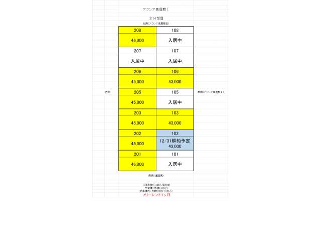 | 備考 | 構造:2×4工法。家賃1ヶ月分フリーレント、仲介手数料なし。TV、冷蔵庫、オーブンレンジ、洗濯機、セミダブルベッド、食器棚、カーテン一式が設置されています。Wi-Fi無料。全面禁煙。1年未満の解約の場合は違約金有。駐車場契約必須。退去時ハウスクリーニング・エアコンクリーニング費用等借主負担。単身者利用のみ。契約時に家財保険料2年間分18,000円がかかり、2年ごとに更新です。契約期間2年ごとに契約更新事務料15,000円(税別)がかかります。 単身向 普通賃貸借 ※同業他社による客付け可(手数料割合:自社50%/他社50%) | ||