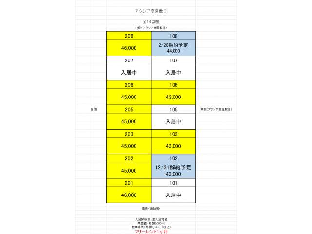 | 備考 | 構造:2×4工法。家賃1ヶ月分フリーレント、仲介手数料なし。TV、冷蔵庫、オーブンレンジ、洗濯機、セミダブルベッド、食器棚、カーテン一式が設置されています。Wi-Fi無料。全面禁煙。1年未満の解約の場合は違約金有。駐車場契約必須。退去時ハウスクリーニング・エアコンクリーニング費用等借主負担。単身者利用のみ。契約時に家財保険料2年間分18,000円がかかり、2年ごとに更新です。契約期間2年ごとに契約更新事務料20,000円(税別)がかかります。 単身向 普通賃貸借 ※同業他社による客付け可(手数料割合:自社50%/他社50%) | ||