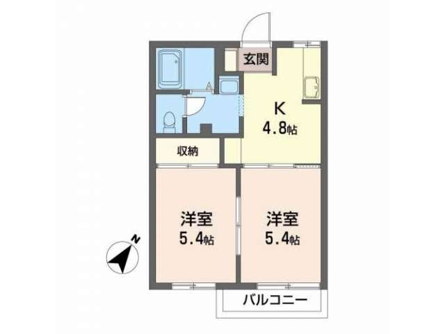 | 詳細間取 | 2K (洋5.4帖×2、キッチン4.8帖) | ||