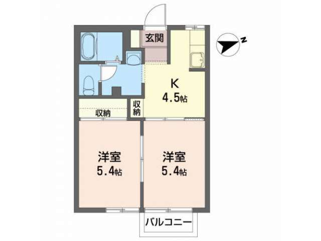 | 詳細間取 | 2K (洋5.4帖×2、キッチン4.5帖) | ||
