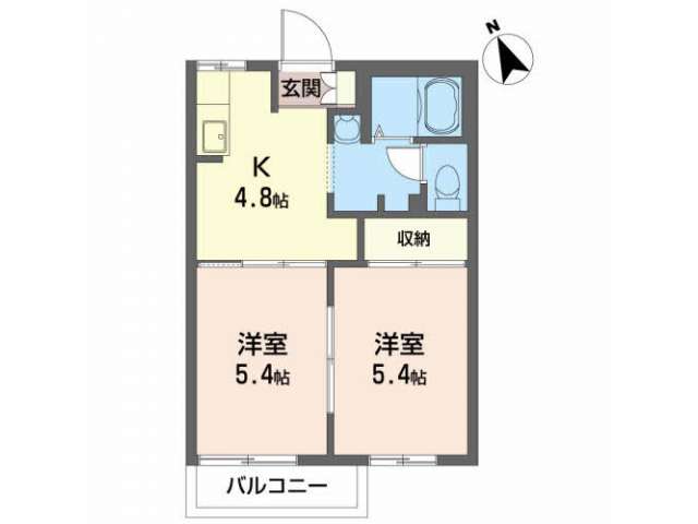 | 詳細間取 | 2K (和5.4帖×1、洋5.4帖×1、キッチン4.8帖) | ||