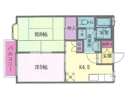 | 詳細間取 | 2K (和6帖×1、洋5帖×1、キッチン4.5帖) | ||