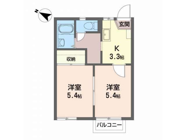 | 詳細間取 | 2K (洋5.4帖×1、和5.4帖×1、キッチン3.3帖) | ||
