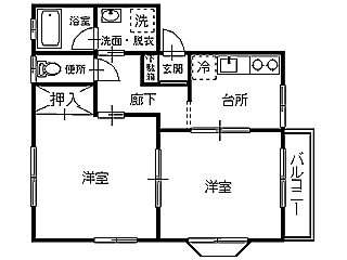 | 詳細間取 | 2K (洋7帖×1、洋8帖×1、キッチン3帖) | ||